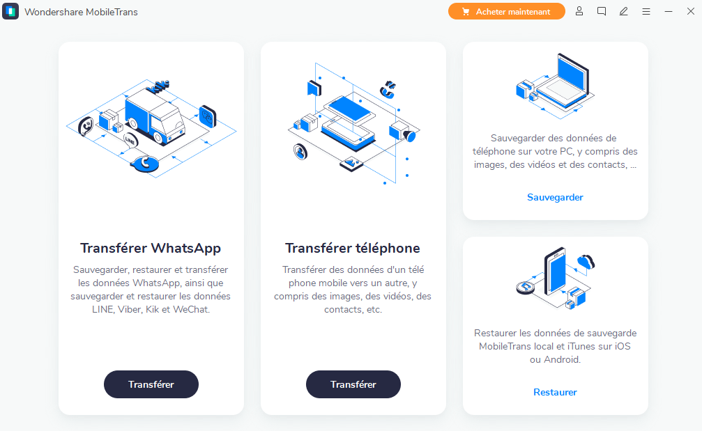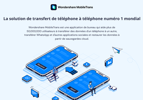 1.MobileTrans est le meilleur logiciel de bureau pour transférer des contacts entre iPhone et Android, ainsi que d'autres types de données, notamment des photos, des applications, des musiques, des messages, des vidéos, etc. Le logicle vous permet de transférer des données entre les divers appareils sous Android (htc, samsung, etc.), symbian (nokia, motorola, etc.) et iOS (iphone, ipod, ipad). Il suffit d'un seul clic pour transférer des données d'un téléphone mobile à l'autre. plus de 2.000 appareils sont compatibles. vous pouvez transférer sélectivement des données entre deux mobiles, sans perte de données. par ailleurs, le transfert s'opère directement d'un téléphone à un autre, pas besoin d'une escale de correspondance au cours du processus. En plus d'être parfaitement compatible avec des milliers d'appareils iOS et Android, il fonctionne également avec les téléphones Windows. Le transfert de WhatsApp vers un nouveau téléphone ne nécessite désormais qu'un simple clic avec MobileTrans, que vous soyez sur un iPhone ou un Android. Il vous aide également à protéger l'historique de vos discussions en sauvegardant vos données WhatsApp sur un ordinateur. Pour récupérer vos messages ou votre historique de discussion, restaurez simplement la sauvegarde WhatsApp sur votre appareil.